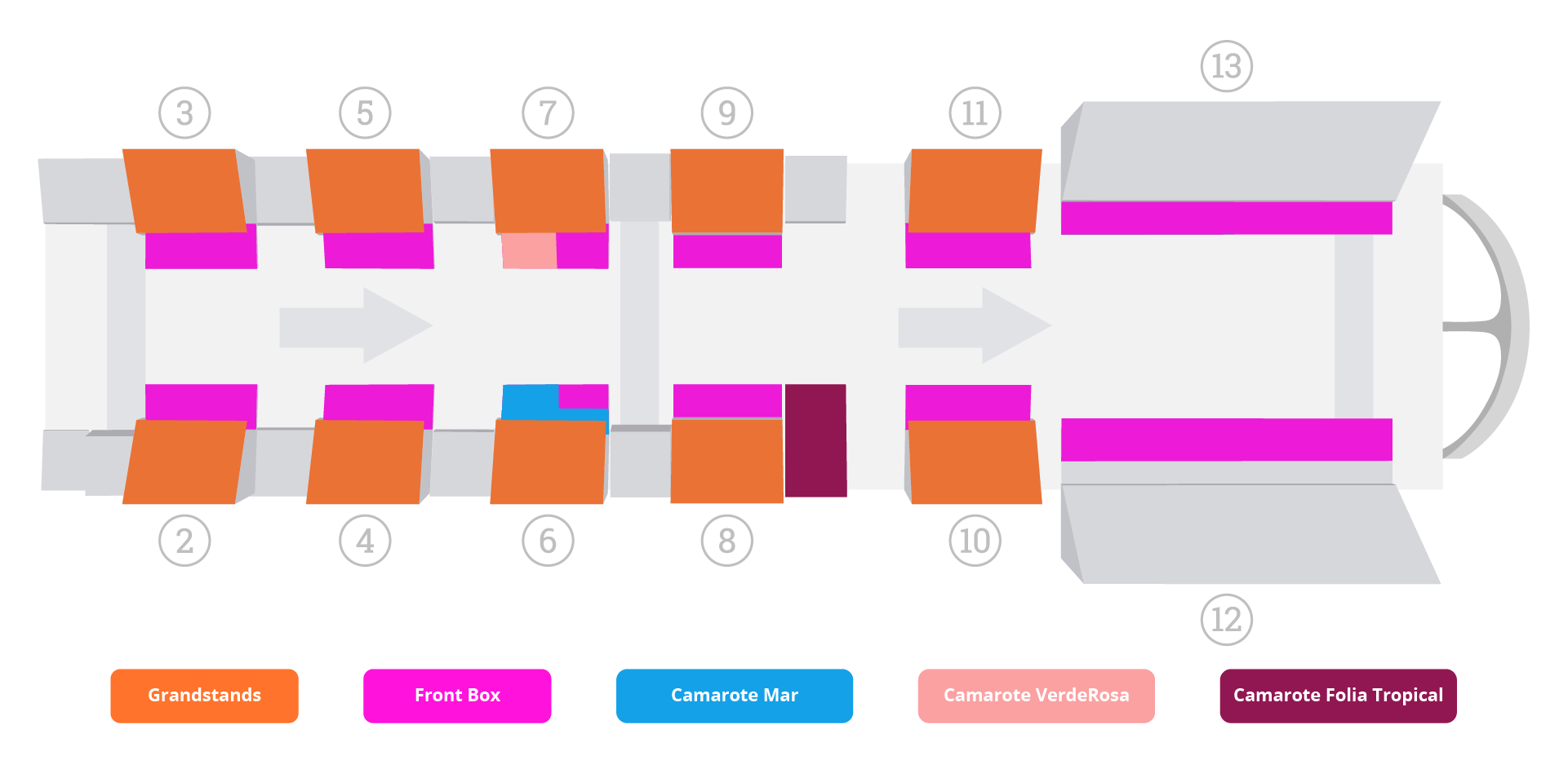 If you are looking for a comfortable option with the best location, a Front Box or ‘frisa’ might be the best for you. These boxes containing 6 chairs and you buy your individual ticket package on it. There are 4 rows, A to D, with A and B closest to the runway and C and D behind but more elevated. In Sectors 12 and 13, the seating extends to Row E and Row H respectively, offering more affordable seating options.